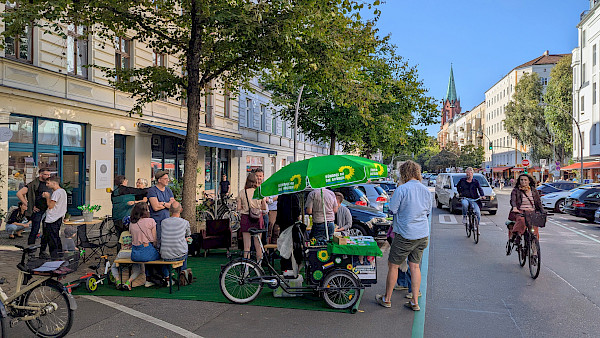 wir haben vor der Stargarder Straße 16 / Ecke Pappellalle ab 15 Uhr für drei Stunden einen Parkplatz besetzt und mit Rollrasen, Sesseln und Tischen bestückt. Wir haben das aus der Stadteilgruppe Prenzlauer Berg Nord von B90/Grüne organsiert, entsprechend waren viele Bündnisgrüne aus Pankow inkl. Bundestagsabgeordnete sowie Mitglieder des Abgeordnetenhauses und der Bezirksversammlung da - und auch viele Anwohnende und Radfahrende sind spontan dazugestoßen. Es gab Kuchen und Getränke und viele Gespräche.